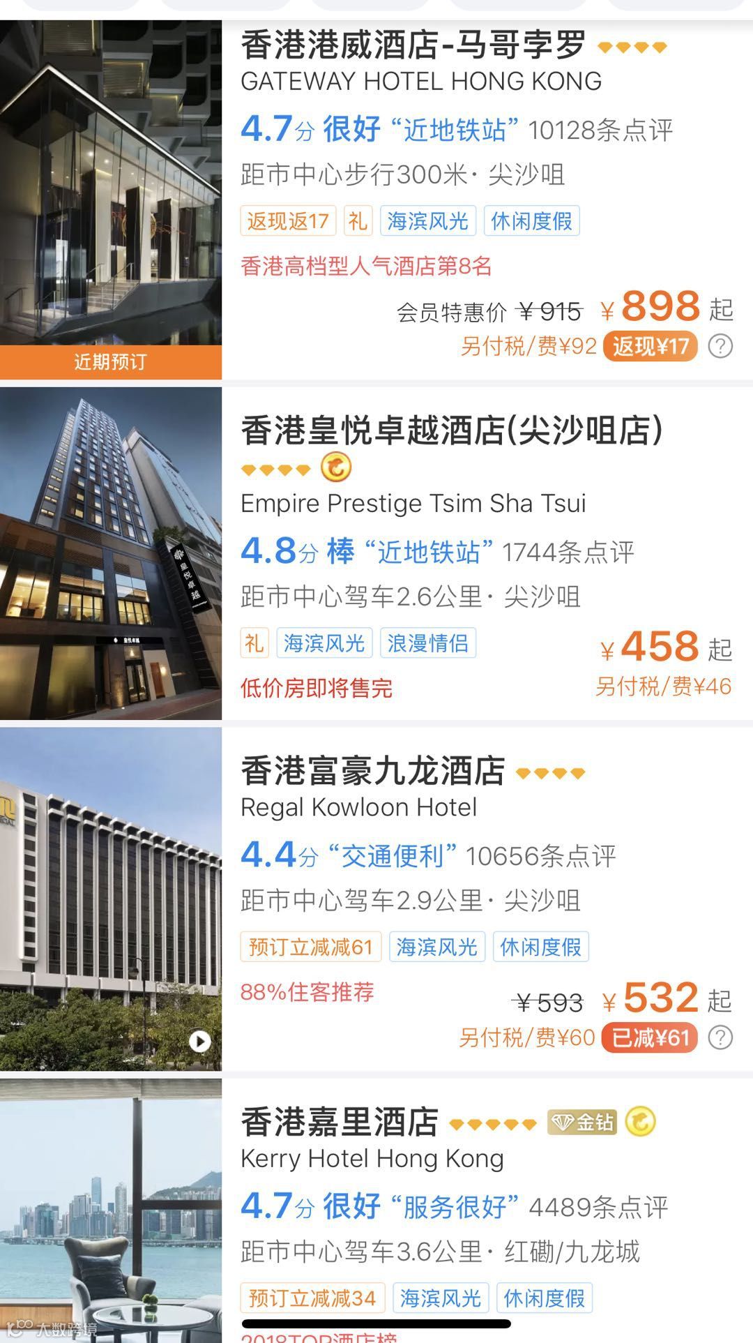 记者在某软件上发现,位于尖沙咀的五星级酒店马哥波罗现在仅为851元,旺季时该酒店价格高达3000元/晚,香港朗庭酒店、JW万豪酒店,目前价格仅为1000元左右,香格里拉酒店价格也在1350元/晚,而往年这个时候香港里拉酒店价格高达10000元。