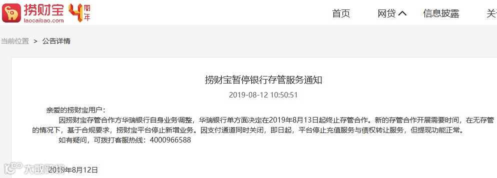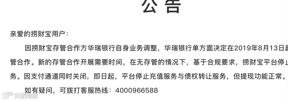 证大投资咨询旗下网络借贷平台“捞财宝”也于同日在官网上发布公告称,因合作方华瑞银行单方面决定在2019年8月13日起终止存管合作,基于合规要求,平台停止新增业务。因支付通道同时关闭,即日起平台停止充值服务与债权转让服务,但提现功能正常。