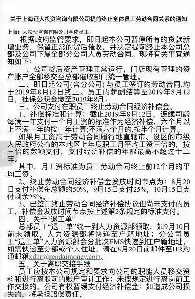 今日更早之前,证大投资咨询关于提前终止全体员工劳动合同关系的邮件通知被曝光。邮件称,即日起暂停所有的贷款新增业务,保留正常的贷后催收,并决定提前终止总部及分公司人员劳动合同,所有员工的劳动合同均于8月12日终止。
