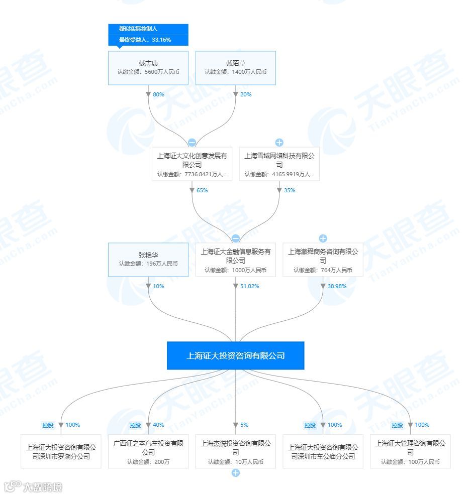 天眼查数据显示,证大金服的运营主体上海证大金融信息服务有限公司拥有两大股东,分别为上海证大文化创意发展有限公司和上海雪域网络科技有限公司,分别持股65%和35%。其中上海证大文化创意发展有限公司的实际控制人为戴志康,持股比例达80%。上海雪域网络科技有限公司的实际控制人为戴卫新,股东还包括张艳华等多位自然人和上海亦舜商务咨询有限公司,而上海亦舜商务咨询有限公司的实际控制人为耿海兵。