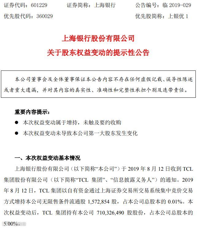 8月12日,上海银行公告,TCL以集中竞价的方式增持上海银行157.3万股,占上海银行总股本的0.01%。此次权益变动后,TCL共持有上海银行7.103亿股,持股比例由4.99%升至5%。