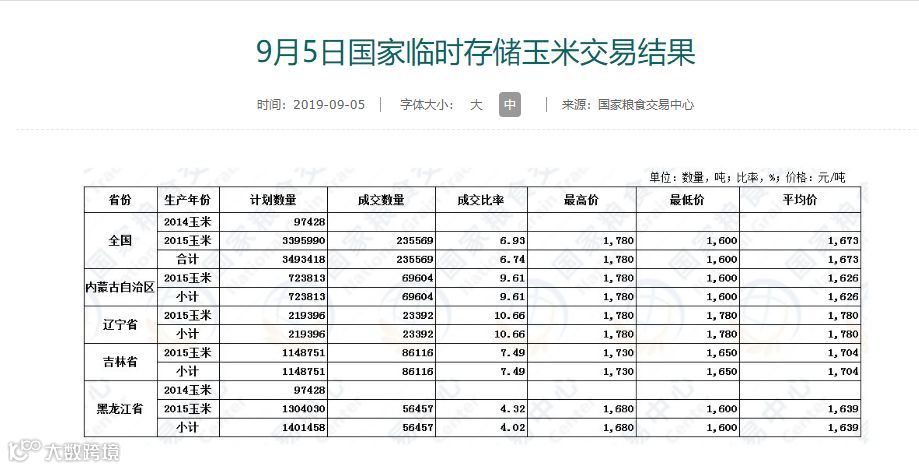 来自中储粮官方信息显示,9月4日拍卖了一批内蒙古玉米。9月5日,拍卖一批北方四省生产年份为2015年的玉米。9月6日黑龙江玉米竞价销售专场,玉米生产年份是2016和2017年。