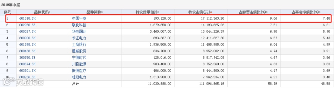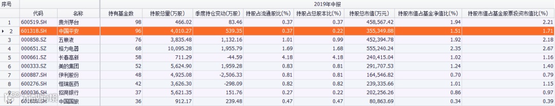 根据东方财富choice数据,在所有基金披露的2019年中报中,中国平安为仅次于茅台的第二大重仓股,共98只基金持有,持股占其流通股的0.37%,总持股市值占这些基金总股票投资市值的1.71%。
