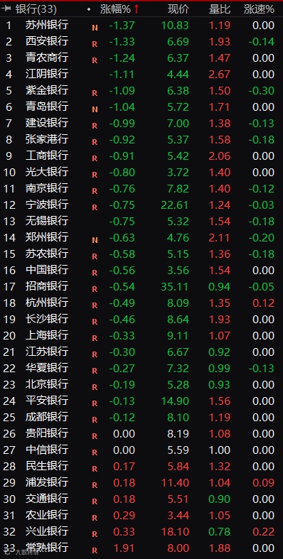 对银行来说,仍然偏短期利空,今日板块来看,银行板块与昨天一样,排在跌幅榜前列,跌幅居前的个股有苏州银行、青农商行、西安银行、建行、工行等。