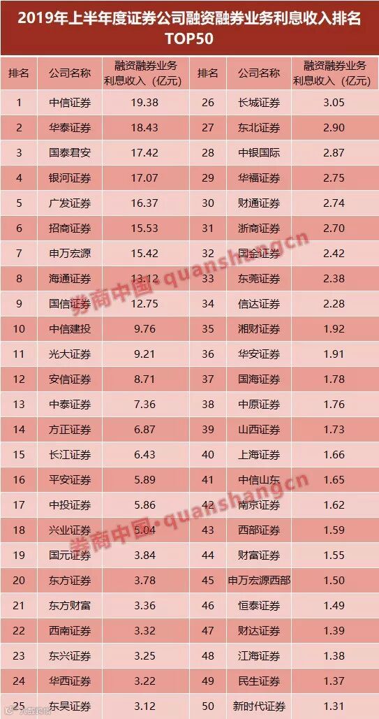 从两融业务利息收入来看,中信证券上半年融资融券业务利息收入为19.38亿元,排名第一。其次是华泰证券、国泰君安,两融利息收入分别为18.43亿元和17.42亿元。