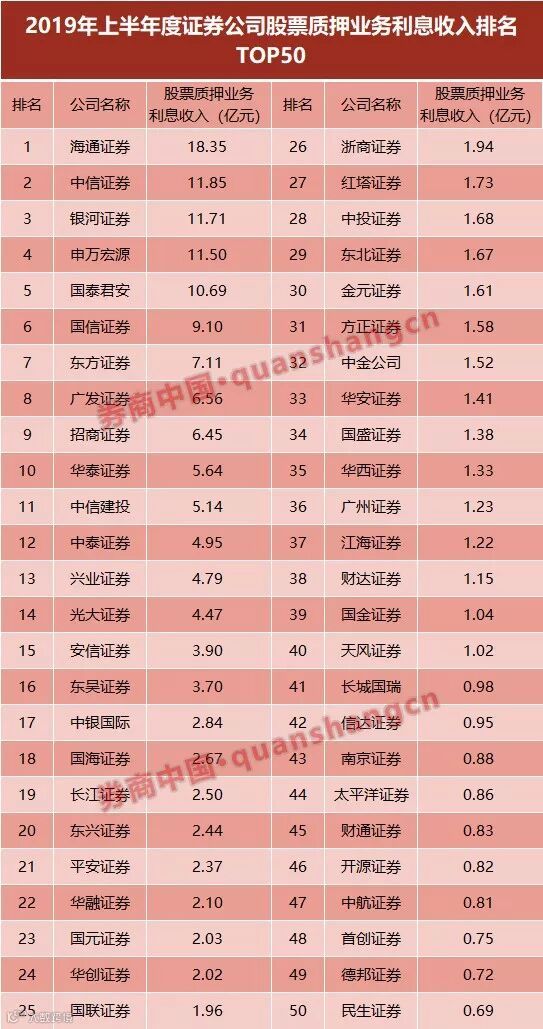 股票质押业务利息收入最高的三家券商为海通证券、中信证券、银河证券,利息收入分别为 18.35亿元,11.85亿元和11.71亿元。申万宏源和国泰君安也在10亿元以上。