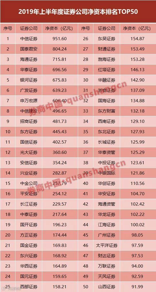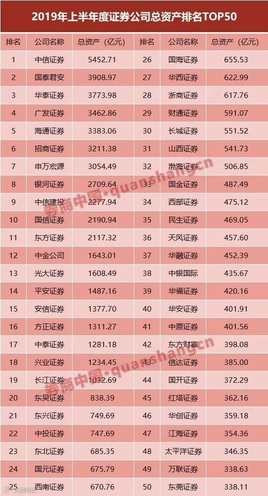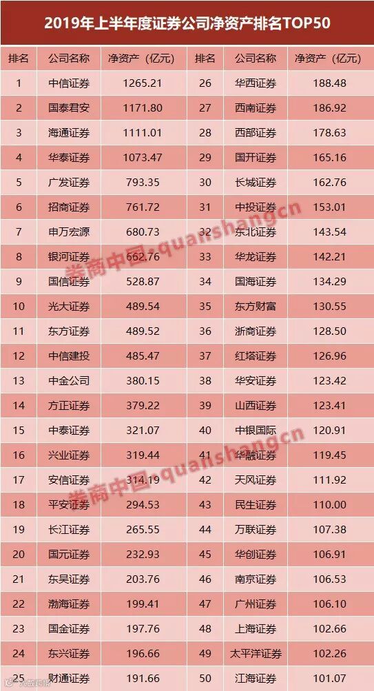 截至今年上半年,净资产排名前50家券商净资产均超过100亿元。其中,中信证券、国泰君安、海通证券、华泰证券净资产超过千亿元,位居行业前四。