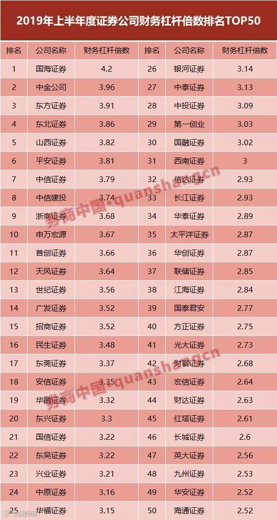 2019上半年,国海证券的财务杠杆倍数名列第一,为4.2倍,也是唯一一家财务杠杆倍数超过4倍的券商。上半年财务杠杆倍数超过3倍的券商共31家。其中,排名前五的还有中金公司、东方证券、东北证券、山西证券。