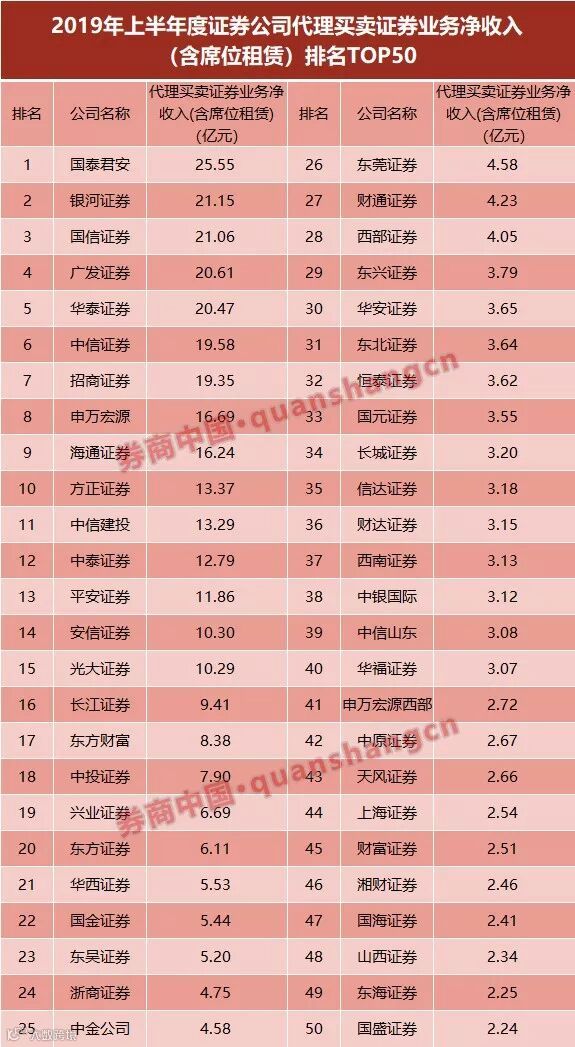 国泰君安2019年上半年代理买卖证券业务净收入(含席位租赁)排名第一,达25.55亿元。国泰君安在该项指标上一直稳坐第一,过去三年,国泰君安连续为代买收入第一。其次是银河证券,上半年代买收为21.15亿元。国信证券排名第三,代买收为21.06亿元。