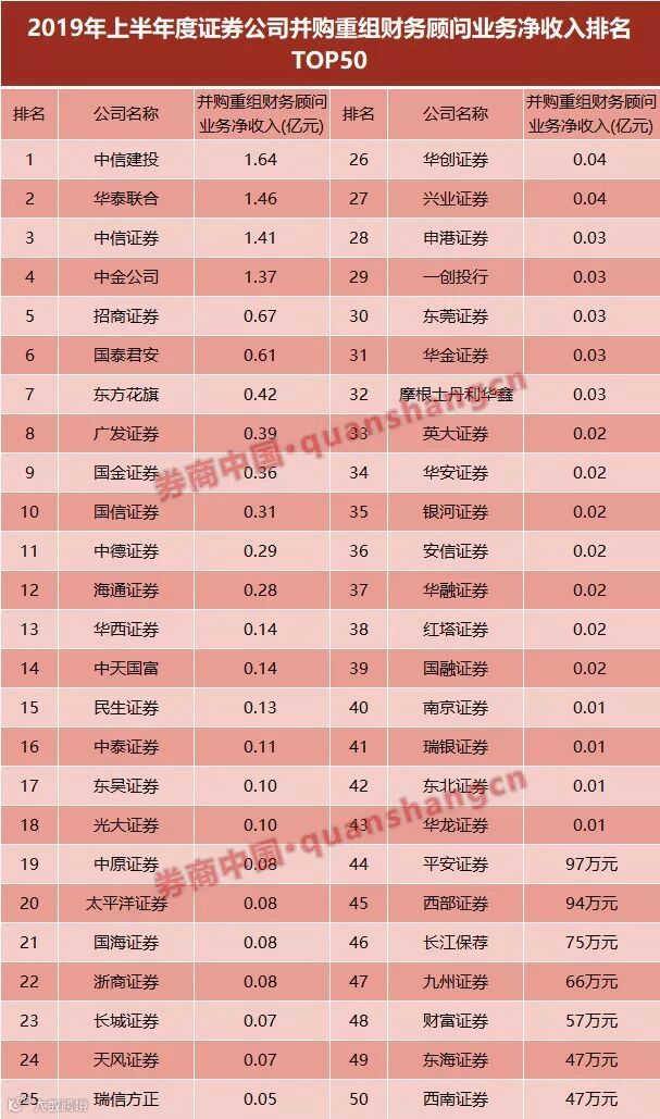 并购重组业务情况来看,今年上半年,共有59家券商获得并购重组净收入,其中有6家券商的并购重组业务净收入超过5000万,分别是中信建投、华泰联合、中信证券、中金公司、招商证券和国泰君安。中信建投证券上半年的并购重组财务顾问业务净收入为1.64亿元。