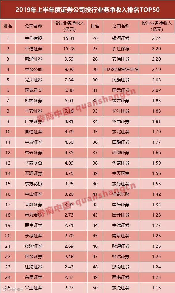 今年上半年投行业务净收入前三为中信建投、中信证券、海通证券。承销与保荐业务净收入前三为中信建投、中信证券、光大证券。并购重组业务净收入前三为中信建投、华泰联合、中信证券。