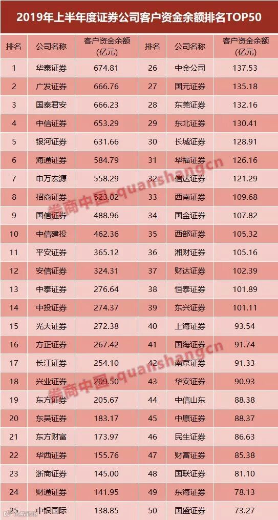 上半年客户资金余额超过100亿元的券商有39家。其中,华泰证券上半年客户资金余额为 674.81亿元,排名第一;广发证券、国泰君安、中信证券、银河证券的该项收入都超过了600亿元,位列前五。