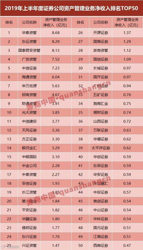 今年上半年券商资管业务净收入超过8亿元的有三家:华泰资管、东证资管和国泰君安资管,分别实现资管净收入8.68亿元、8.29亿元和8.13亿元。
