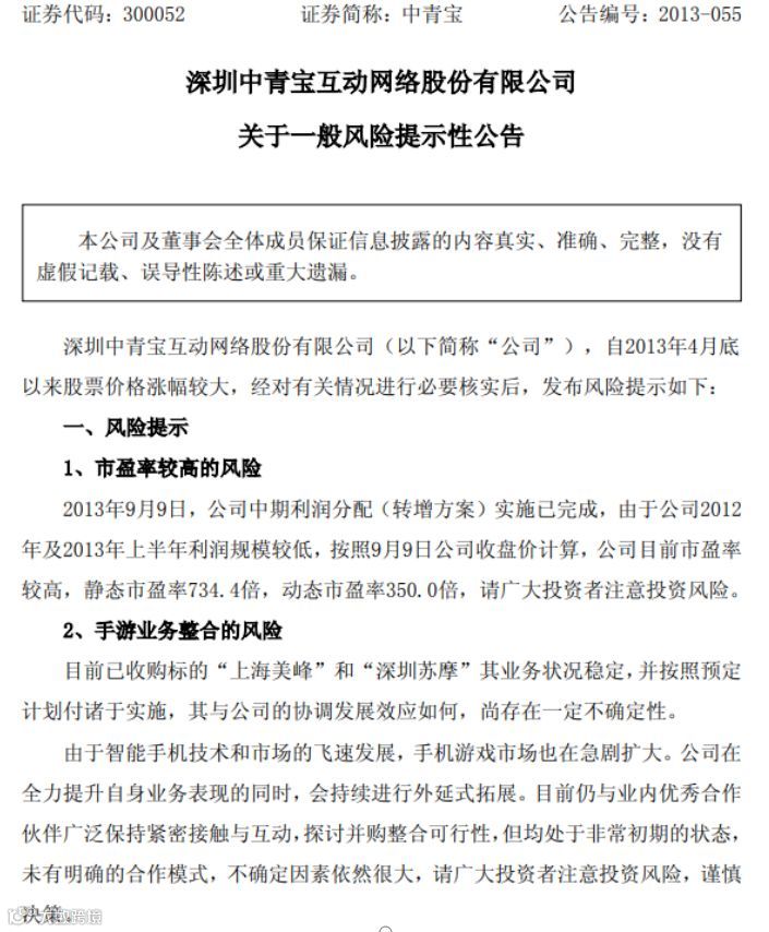 从股价情况来看,阳雪初操纵账户最早买入中青宝实在2013年4月23日,彼时中青宝股价仅为6元左右。此后,中青宝股价一路拉升,至2013年9月,股价已飚至50元,涨幅超过7倍。期间,中青宝股价曾数次出现交易异常波动情况,公司曾于2013年9月发布一般风险提示性公告,对2013年4月底股价涨幅较大的情况发布风险提示。