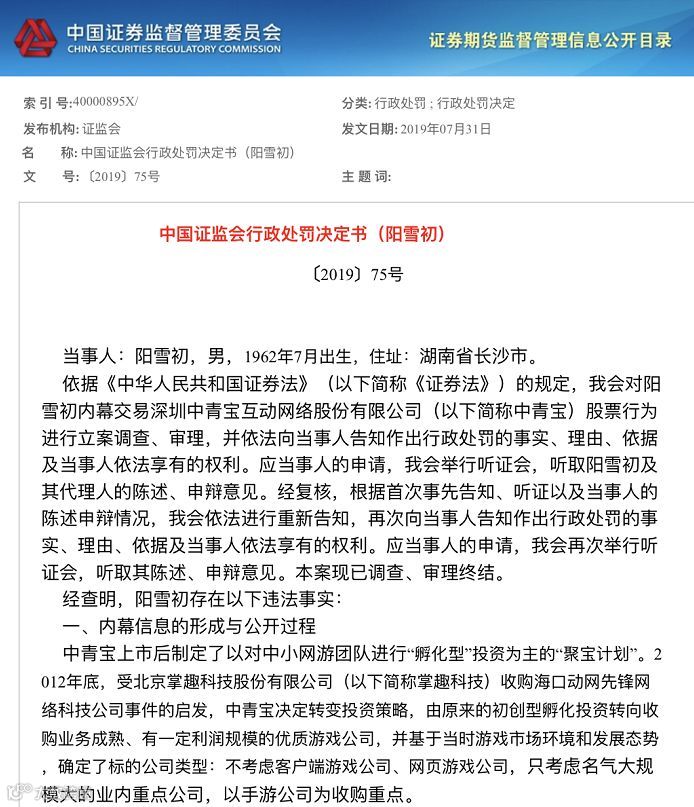 不过,根据决定书,此次内幕消息的知情人、中青宝董事长李某杰或许并未遭遇处罚。阳雪初及其代理人在申辩中称,阳雪初知悉内幕信息的唯一来源是李某杰,但未追究李某杰泄露内幕信息的责任,以此希望证明阳雪初并非内幕消息知情人。证监会则表示,结合证据来看,可以推断出李某杰未有泄漏内幕信息的主观故意。