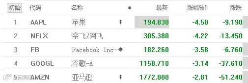 科技股领跌全市场。盘中主要的科技股跌幅皆较大,苹果一度跌超4%,亚马逊跌2.7%,奈飞跌3.5%,谷歌跌3%,Facebook跌2.88%,微软跌2.8%。