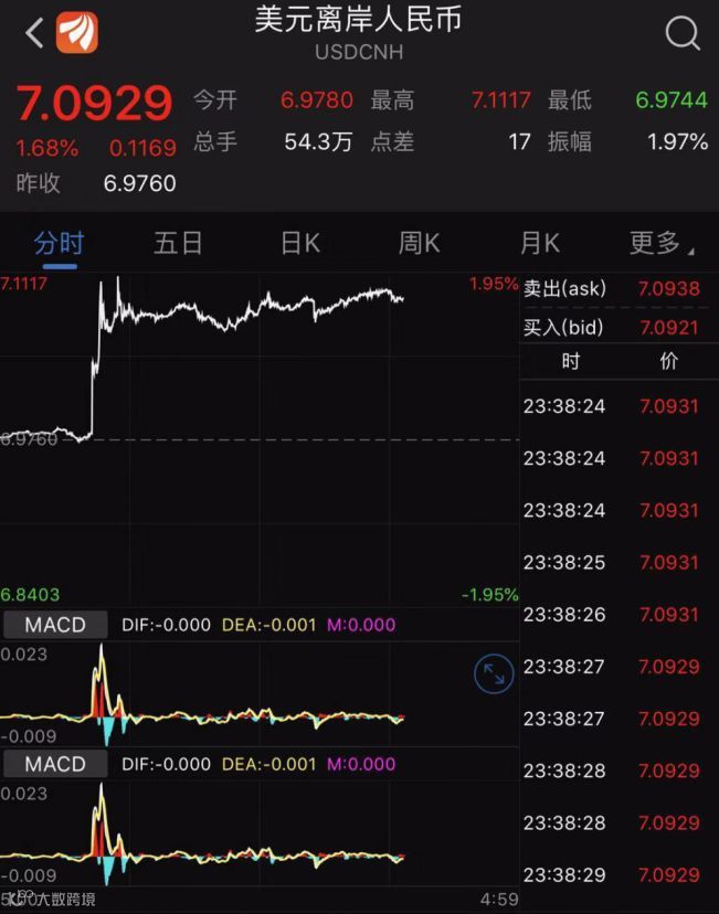 今日突然破7的离岸人民币继续杀跌,目前来到了7.09的位置。