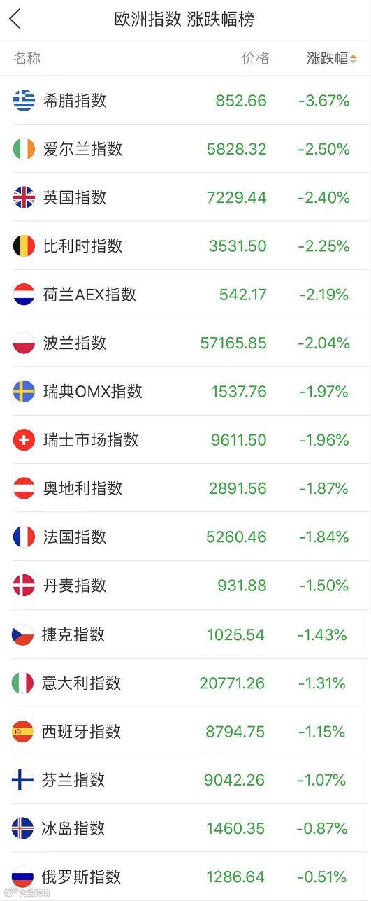 晚上欧洲股市更是全线下行。