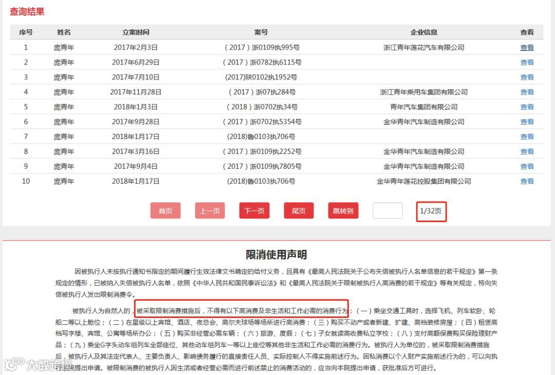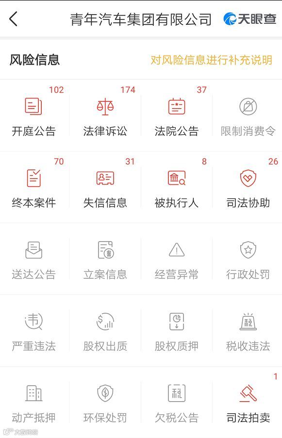 不过,根据天眼查数据显示,在该公司风险信息部分,青年汽车集团共遭遇102份开庭公告、174份法律诉讼、37份法院公告、31份失信信息,8次成为被执行人、1次司法拍卖等。目前公司多位高管庞青年、王淑丹等股权已被法院冻结。