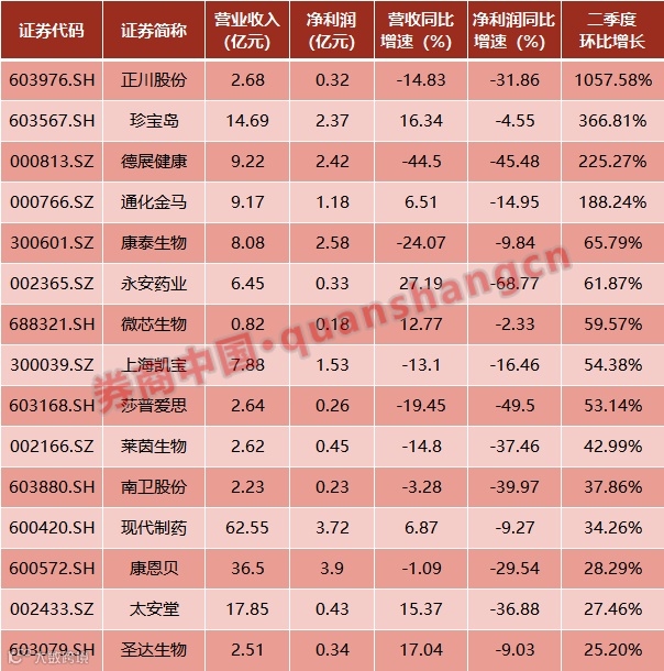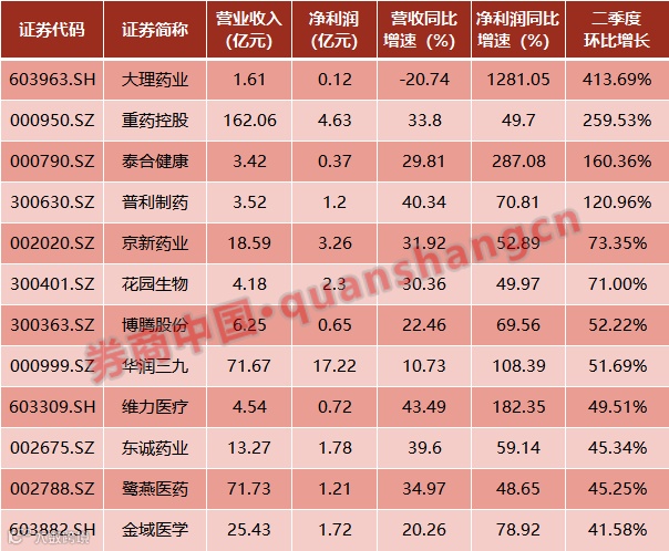 其中,大理药业等12家公司上半年净利增长在48 %以上,二季度环比增长41%以上,业绩增长表现更好(如下表)。当然,有些公司非经常性损益对净利增长影响较大。