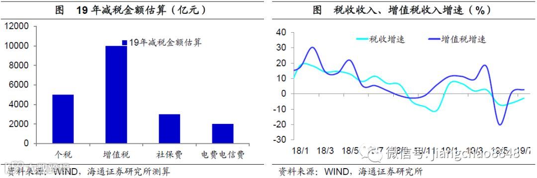 加大减税力度,政府过“紧日子”。不搞刺激并不是没有政策,今年政策最大的亮点在于减税降费。19年政府宣布减税降费2万亿,我们估算其中个人所得税减免大约5000亿,增值税下调大约10000亿,社保减税大约3000亿,还有2000亿是电信费、电费等的下调。事实上,19年5、6两个月税收增速降幅都在6%以上,7月税收增速同比下降3%,估算全年税收增速可能在-2%左右,而正常情况下税收增速应该等于GDP名义增速,上半年还有8.3%,这意味着政府主动减少了10%的税收增速,而18年的税收总额超过15万亿,这意味着19年的减税就达到1.5万亿。