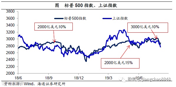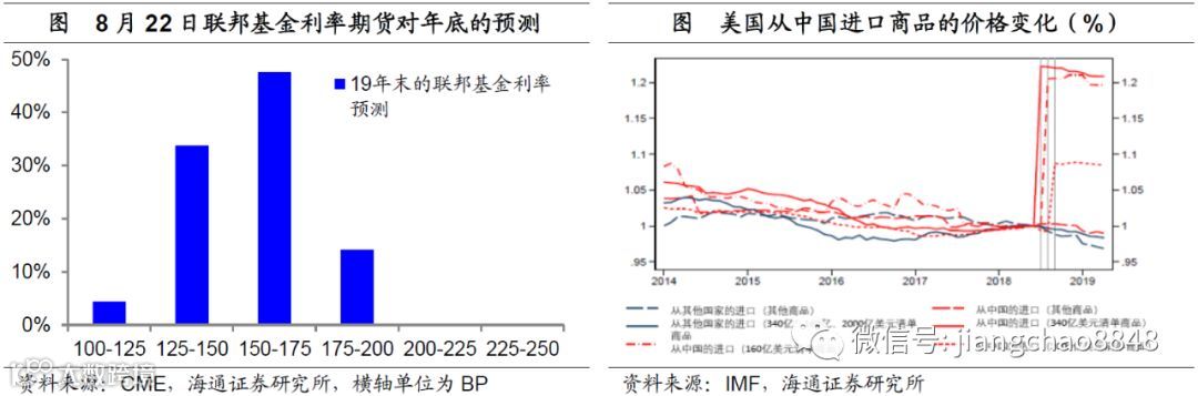 但是美国降息并非没有约束,首先的约束在于通胀。IMF的5月研究报告《TheImpact of US-China Trade Tensions》显示,美国对中国产品征收的关税大部分体现为到岸价的提升,事实上,美国7月份的物价已经开始上升,应该就有之前关税上调的影响。正是考虑到加税的冲击,美国主动把3000亿美元进口中一大半商品的10%关税上调延后到12月15日以后。