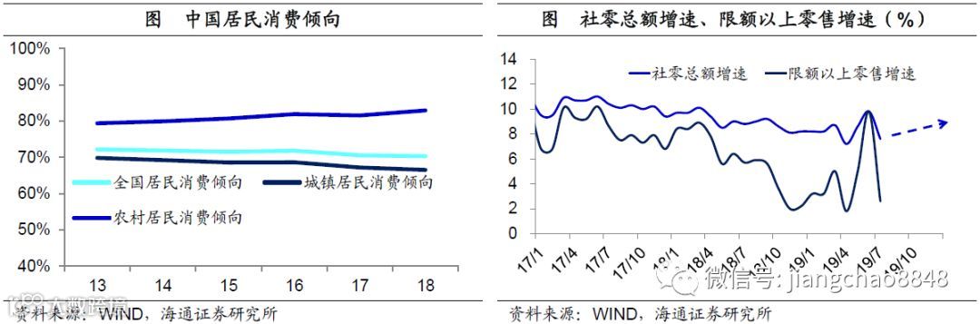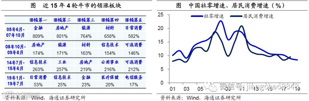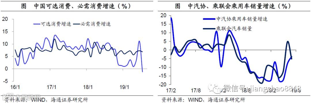 必需消费稳定,可选消费回升。在中国的两大类消费中,占比一半的必需消费在过去3年保持稳定增长,表现与经济周期无关,未来下行的概率不大。而占比一半的可选消费增速在过去一年大幅下滑,主因占比最大的汽车消费跳水。但这主要因为18年购置税优惠政策的退出,而在高基数效应消失之后,19年下半年的汽车销量增速有望见底回升。事实上,今年6月份的乘联会汽车增速大幅回升转正,而7月增速降幅仅为5%;中汽协乘用车销量增速降幅6、7两个月均在缩窄,均显示汽车消费已有所改善。