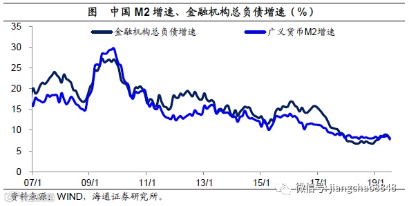 去杠杆降低利率。恰恰是在去杠杆之后,中国全社会的融资成本开始重新下降。自18年2季度以来,央行公布的银行贷款加权平均利率从5.97%降至19年2季度的5.66%。虽然金融机构钱少了,但是因为实体经济不需要那么多钱了,社融和M2增速差下降,利率出现了明显下降。