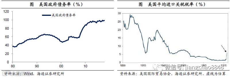 减税不可持续,关税大幅上升。但本轮特朗普与以往三轮减税的区别在于,过去三轮美国政府债务率均在40-60%左右,而本轮美国政府债务率高达100%,加上国会两党分裂,因而美国本轮财政刺激不可持续。在减税效应减退之后,特朗普把提高关税作为贸易政策的重点,希望在国际上占便宜,来讨好国内的选民。但关税政策其实是在上个世纪的大萧条中被证明是完全失败的政策。当时由于全球金融危机的爆发,大家以邻为壑,纷纷提高关税,结果导致了全球需求萎缩,经济长期萧条,乃至于引发了世界大战。