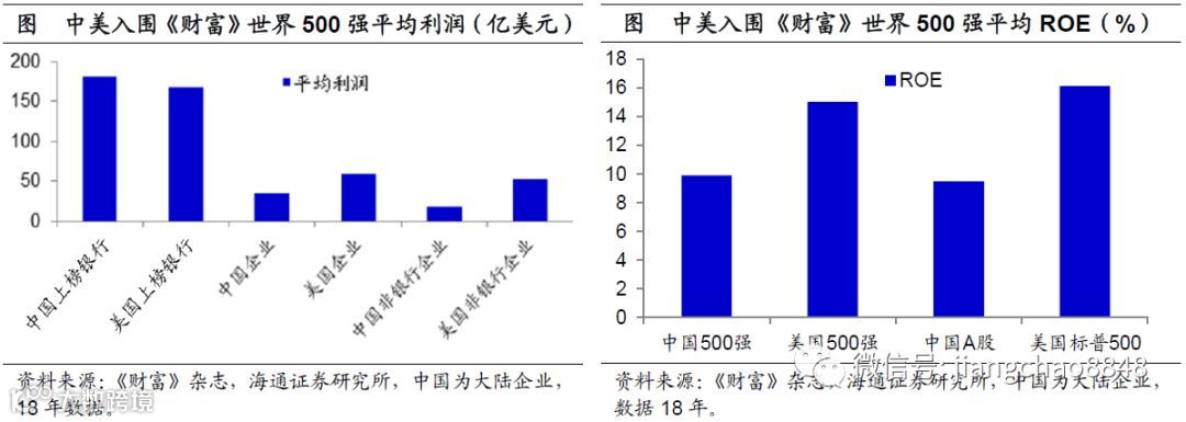 利润指标相差甚远。但是,从质量指标来比较中美经济,我们依然与美国存在巨大的差距。在世界500强企业中,19年中国大陆上榜企业119家,18年平均销售收入为665亿美元,与美国企业差距不大,但是中国企业平均利润为35亿美元,远低于美国的60亿美元。而且中国企业一半的利润被银行拿走了,而美国银行只拿走了18%的利润,因而中国非银行企业的平均利润只有19.2亿美元,只相当于美国的1/3左右。从最重要的利润率指标来观察,19年中国上榜企业的平均ROE为9.9%,而美国上榜企业的平均净资产收益率高达15%。