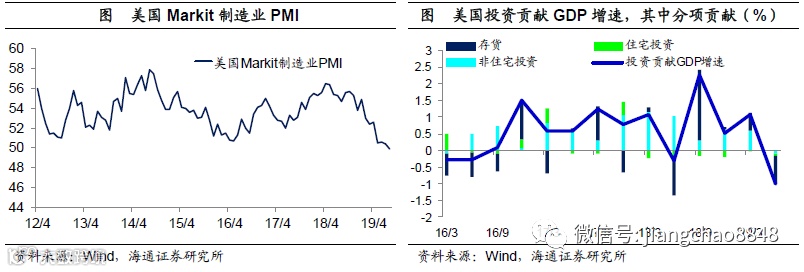 美债利率倒挂,衰退信号出现。虽然美国经济以消费为主体,但从理论上说,经济增长来自于储蓄和投资,因而历史数据显示投资是经济变化的领先指标,尤其是存货和地产投资,美国过去50年当中的6次衰退之前首先出现的都是存货或者地产投资的负增长,因而当前存货和地产投资的贡献转负是一个重要的经济衰退信号。
