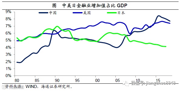 金融业过于发达。为何中国的企业规模很大,而且不赚钱?这应该与中国过于发达的金融业密切相关。从金融业占GDP的比重来比较,18年中国的占比高达7.7%,超过美国的7.4%和日本的4.1%。而在2015年,中国金融业占比曾经高达8.4%,而美国金融业占比的峰值也只有7.7%,日本在1990年的最高值仅为7%。中国金融业占GDP比重上升的起点是2006年,从2006年到2016年,中国金融业占GDP的比重翻了一番。