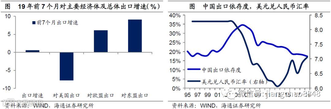 贸易多元发展,汇率贬值对冲。而即便是市场最为担心的对外贸易,今年前7个月中国出口依然维持了正增长,原因在于虽然我们对美国出口大幅下降,但得益于一带一路政策、贸易多元化,对欧盟和东盟出口大幅上升,弥补了对美出口的下降。而且考虑到中国对出口的依存度比06年顶峰的35%下降了一半,再加上过去1年汇率贬值了约10%,很大程度上抵消了关税上升的影响,因而无须对中国出口过于担心。