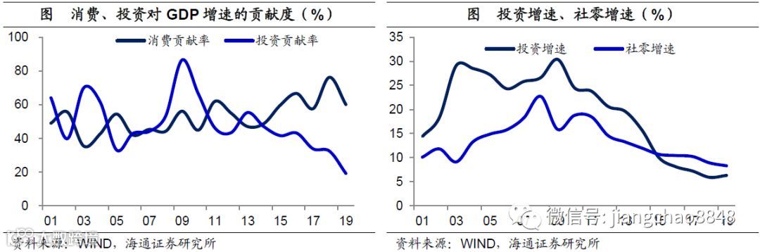 消费已成主角,无惧投资下行。过去中国经济主要靠投资拉动,无论是投资增速还是投资对经济增长的贡献度,都远超消费。但是从2015年开始,消费增速就超过了投资增速,今年前7个月的消费增速为8.3%,高于5.7%的投资增速。而从对经济增长的贡献率来看,上半年消费的贡献率为60%,远超投资的19%。因而未来即便投资增速小幅下滑,靠消费的回升也能稳住经济增长。