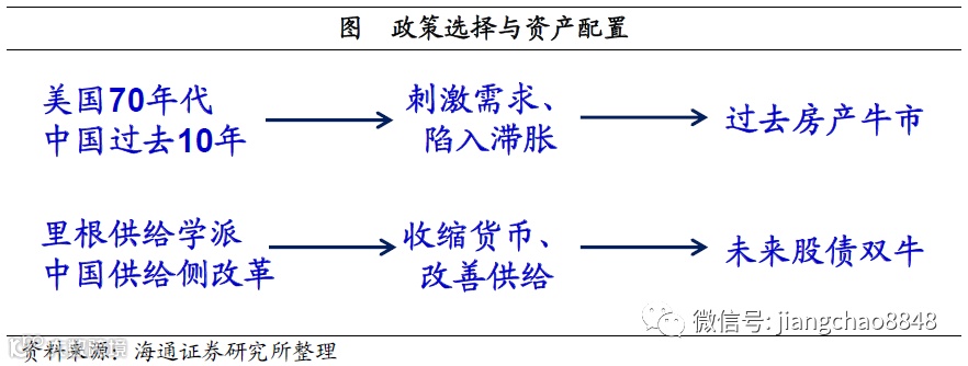 货币超发滞胀,减税股债双牛。而各类资产估值发生变化背后的原因其实在于政策选择。在美国70年代,货币超发导致了滞胀,推动实物资产价格上涨,与此同时利率上升打压金融资产估值,这其实和中国过去10年非常类似。而在1980年以后,里根的供给学派收缩了货币、降低了利率,同时减税改善了供给,所以出现了股债双牛。而中国供给侧结构性改革的实施,通过去杠杆降低了货币增速,利率也开始大幅下降,同时大规模减税降费改善供给,其实也有希望出现股债双牛。