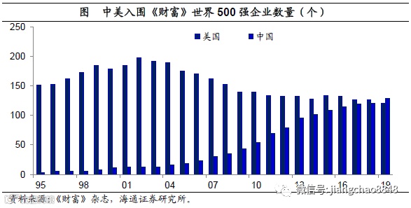 500强企业超过美国。体现中国经济发展的另一个重要榜单是世界500强企业的数量。2019年7月,《财富》杂志发布了2019年世界500强企业排行榜,中国入围129家,超过美国的121家,首次排名全球第一。而在20年以前,中国的入围企业不到10家,美国则接近200家。