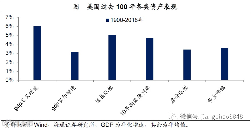 长期看:经济增长是资产回报之基。从1900年到2018年,美国的实际GDP增长了40倍,而名义GDP增长了近1000倍,折合年化涨幅分别为3.1%和6%。而经济增长是资产回报的基础,美国道指过去118年的年均涨幅为5%、10年期国债利率的均值为4.7%,均接近其GDP名义增速。而黄金和房地产等的年均涨幅为3%左右,其实和长期的通胀涨幅接近,也就是从长期来看,通胀是决定实物类资产表现的核心因素。