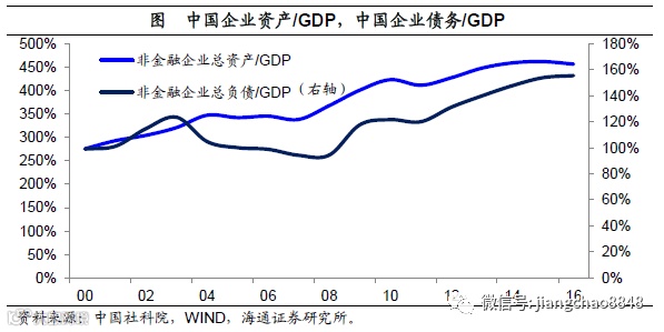 加杠杆做大企业,也压垮企业。而中国企业的扩张,也是极大地受益于举债加杠杆。根据中国社科院的估算,在2006年时中国非金融企业的总资产为75.8万亿,到2016年上升至340万亿,年均增速高达16.4%。与此同时,中国企业部门的债务开始大幅上升。2006年中国企业部门总债务为21.7万亿,相当于GDP的100%。而到2016年中国企业部门总债务升至116万亿,占GDP的比重达到156%。假设社会融资成本平均为7%,那么企业部门每年支付的融资成本就要占据GDP的10%。