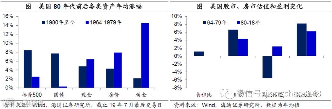 美国80年前后:实物和金融资产表现逆转。其实即便在美国,虽然金融资产长期跑赢实物资产,但是在80年代以前的15年,黄金和房地产等实物型资产的表现远好于金融资产。然而到了80年代以后,发生了大逆转,股市和债市等金融资产远远跑赢了房子和黄金等实物资产,其中股市和债市的年均回报率在8%左右,而房产只有4.3%、黄金只有2.1%,后两者甚至是跑输现金的。为何股市和房市表现逆转,主要的原因在于估值的变化,在80年代之前房市估值提升、而股市的估值下跌,而在80年代以后,股市的估值提升、而房市估值不再变化。