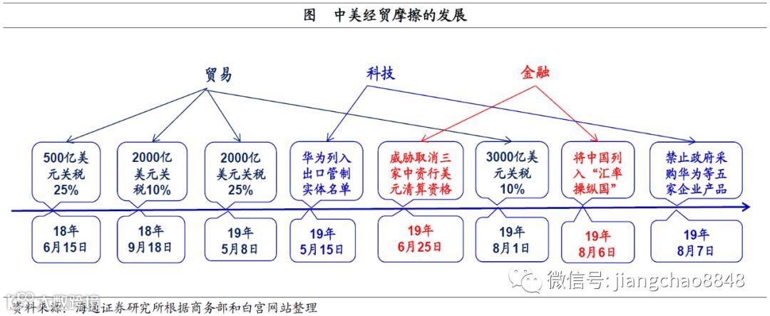 中美经贸摩擦升级。自从18年6月美国首次对中国出口500亿美元产品加税以来,目前美国对中国出口产品的关税已经经历了三次上调,美国总统特朗普也已经公告将在9月1日对中国剩余3000亿美元产品加征10%的关税。而且贸易摩擦已经升级到了科技和金融领域。5月美国政府把中国华为及其子公司列入出口管制“实体名单”,8月禁止政府购买华为等五家科技企业产品,目的就是阻碍中国的科技发展。而6月美国媒体发文威胁取消三家中资行的美元清算资格,8月美国财政部捏造所谓“汇率操纵国”,则是上升到了金融层面。