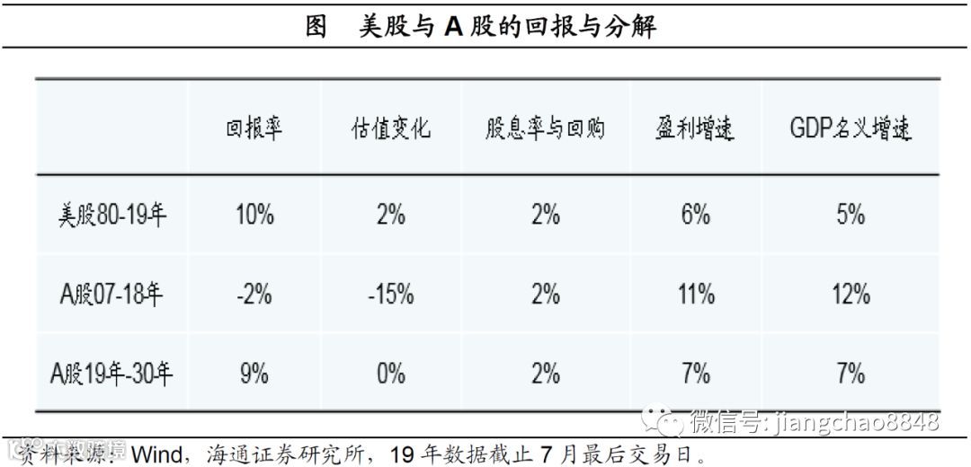 如果未来在低利率环境下中国股市的估值不再压缩了,那么企业的盈利就可以反应在股市的回报中。而哪怕经济增速减速到5-6%,但其实放眼全球也是非常高的经济增速,再加上每年2%的物价,我们还可以实现每年7-8%左右GDP名义增速,对应企业盈利也能保持7-8%左右的增长,加上2%的股息率,那么未来A股就可以提供9-10%左右的年均回报,其实就可以和过去40年的美股相当了。