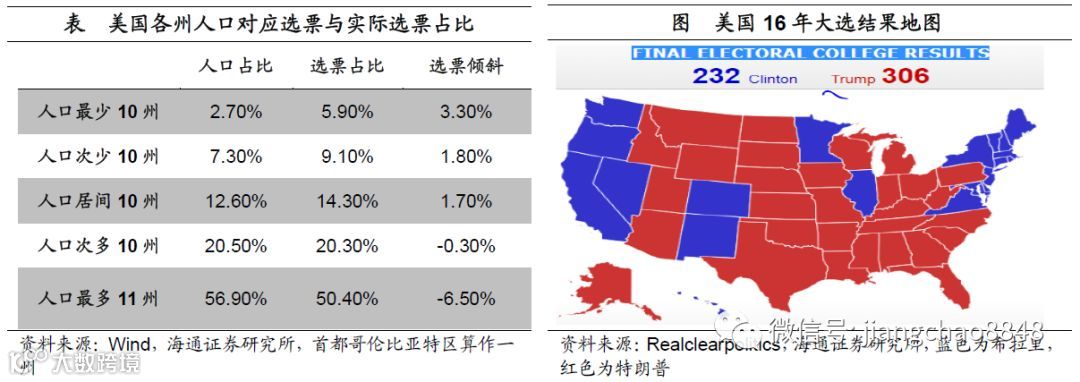 少数可以决定多数。为什么特朗普的支持率更低,反而赢得了选举?原因在于美国的总统选举并非一人一票的普选制,而是赋予小州更大的投票权。美国人口最少的41个州,其人口比是45.8%,但选票占比高达52.4%,也就是只要赢了最小的41个州,哪怕支持率不到一半也可以做总统,少数人可以决定多数人的命运。从2016年大选结果来看,美国东部和西部都支持希拉里,而中部都支持特朗普,东部有金融中心纽约、西部有科技中心加州,人口在持续流向东部和西部,中部地区的铁锈带虽然人少但是票多,所以特朗普输了普选票但赢了选举,成为美国历史上少有的少数派总统。