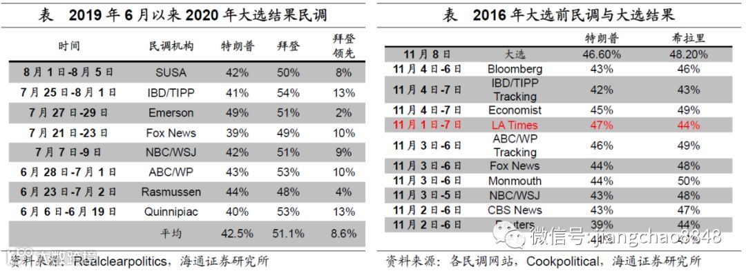 民调落后的总统。目前,特朗普最大的目标是争取2020年竞选连任。近两个月美国主要民调结果显示,民主党候选人拜登的支持率远高于特朗普,平均领先8.6%。虽然经历了2016年大选之后,大家不太相信民调数据,原因是希拉里民调一直领先,但是最后输掉了选举。但民调本身并没有错,最终大选结果显示特朗普的普选票是46.6%,低于希拉里48.2%,因此特朗普并没有获得多数人的支持,只是赢在了选举制度上。