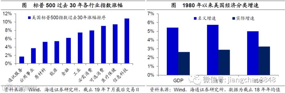 美国过去30年:消费和科技领涨。在美国过去几十年的牛市当中,我们发现领涨的四大板块分别是信息科技、医疗保健、可选消费和必需消费,也就是消费和科技行业领涨。而其根基则是在于以消费为主导的经济增长模式,过去40年,其GDP年均增速为2.6%,考虑物价之后的GDP名义增速均值为5.4%,而消费名义增速均值为5.7%。只要消费整体保持在5-6%左右名义增速,那么优秀的消费型企业就有希望实现10%左右的业绩增速,这其实是其股市回报的来源。