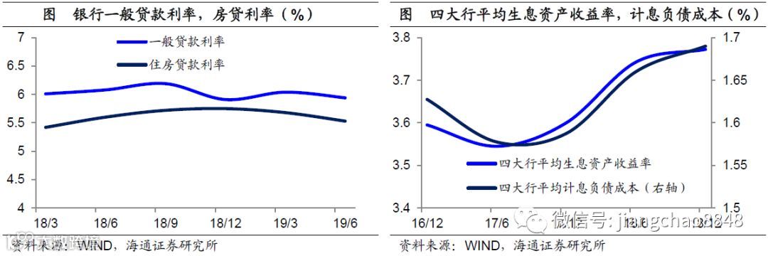 贷款利率未降,银行转嫁成本。但是最重要的银行贷款平均利率,在同期降幅并不明显。原因在于中国银行业的存款和贷款还不够市场化。虽然目前央行已经放开了对存贷款利率浮动区间的管制,但由于央行设定的存款基准利率过低,目前1年期存款基准利率为1.5%,而货币基金收益率依然在2%以上,这就使得银行在存款端的成本一直有上行压力。从四大国有银行公布的负债成本来看,从17年末到18年末的负债成本均有上升,平均升幅为10bp左右。而为了弥补成本的上升,其生息资产收益率平均上升了17bp,这就可以解释为何贷款利率难以下降。