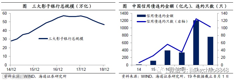 金融去杠杆,打破刚性兑付。因此,真正想要降低实体经济的融资成本,光靠降息是不够的,必需控制住举债的规模,这也是为什么在过去两年我们把去杠杆作为首要政策。而18年开始的资管新规等金融监管要求穿透式原则,这使得通道业务等监管套利无处遁形,信托、基金子公司、券商资管等影子银行载体的规模都开始大幅收缩,在过去1年三大影子银行的资管规模收缩10多万亿,总规模萎缩了超过20%。18年中国债券违约金额超过1000亿,19年5月包商银行因为严重的信用风险而被托管,我们在实体经济和金融市场都打破了刚性兑付。