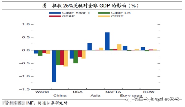 中国所受冲击较大。由于当前美国经济比中国大,因而经贸摩擦对中国的影响也更大。根据IMF今年4月份最新发布的《世界经济展望》,如果美国与中国的所有产品都征收25%关税的影响,美国经济的减速幅度大约在0.3%到0.6%之间,而中国经济减速幅度在0.5%到1.5%之间。在7月份最新的中国经济年度审查报告中,IMF估算如果美国对中国进口产品全部征收25%的关税,此后1年中国经济增长率将会被压低0.8%。