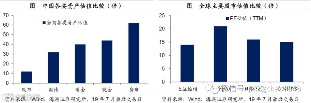 便宜是硬道理:股>债>黄金>现金>房。在中国目前各类资产中,单纯就估值水平来比较,我们认为房产是最贵的,一线城市房产的租金回报率为1.6%、相当于62倍估值。而货币基金收益率2.3%、相当于43倍估值。今年黄金表现的不错,因为黄金短期有避险价值,但从长期来看,黄金只能受益于通胀,而中国目前通胀率在2.5%左右,所以黄金的估值也不便宜,相当于40倍左右。而国内真正有便宜的是金融资产,其中10年期国债利率3.1%,相当于32倍估值,5年期AA级企业债利率4.6%,相当于22倍估值;而最便宜的是股市,上证综指的市盈率只有13倍,不仅低于国内各大资产,在全球来看也是最便宜的之一。因此,单纯从估值水平来看,中国各类资产投资价值当中“股>债>黄金>现金>房”。