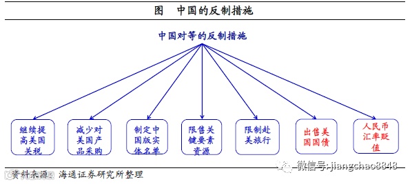 中国对等反制措施。但是中国也有很多反制措施,包括我们也大幅提高了美国进口产品关税税率,减少了对美国农产品的采购,准备把损害中国企业利益的美企列入“不可靠实体清单”,还可以考虑限售稀土等关键要素资源,减少赴美旅行等。而在金融领域,人民币汇率贬值和出售美债也会对美国产生影响。