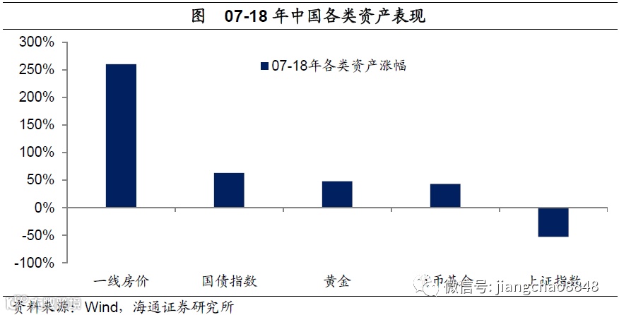 过去十年:房市领涨、股市领跌。但是从07年到18年,中国一线城市房价平均涨幅为2.6倍,而上证指数代表的股市跌幅高达53%,房市的表现远好于股票、债券、黄金和现金,是国内资产配置的最大赢家,而股市则是大输家。
